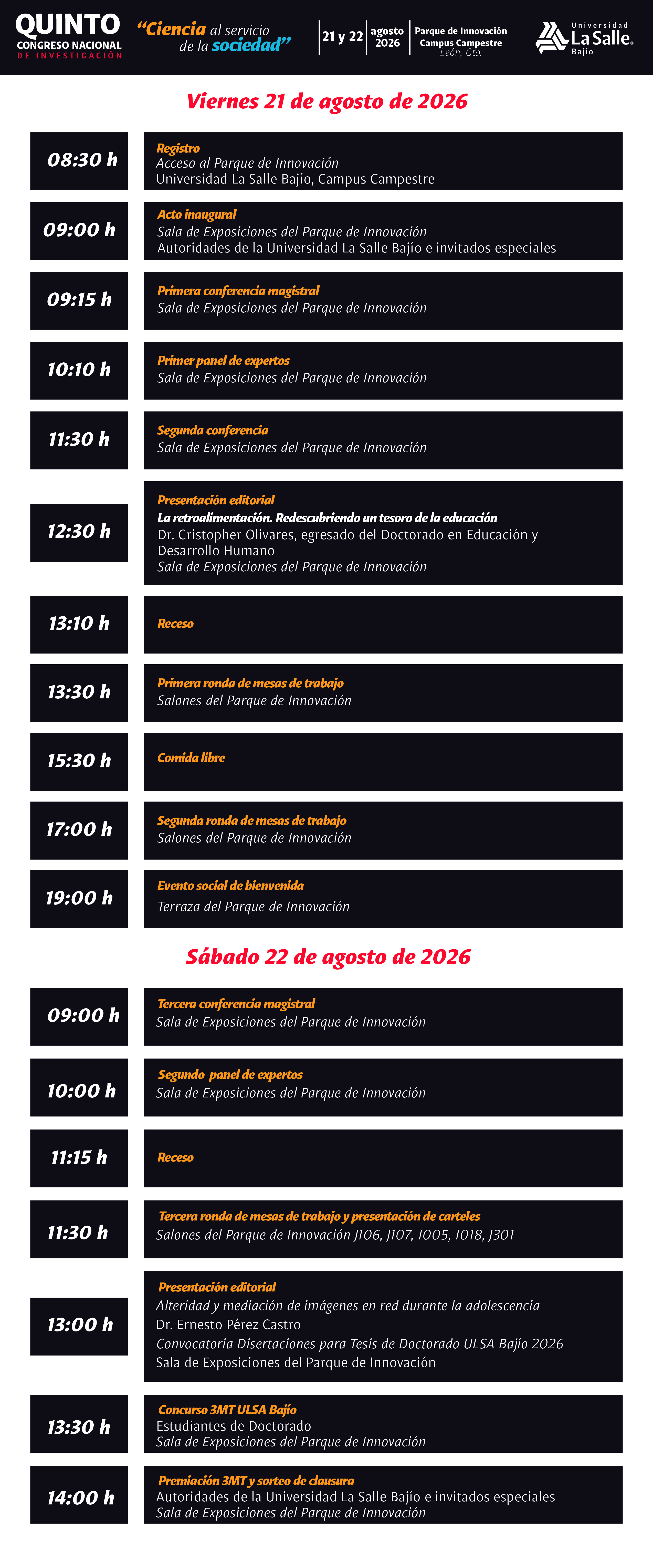 El Quinto Congreso Nacional de Investigación se realizará los días 21 y 22 de agosto 2026 en modalidad presencial. Según lo requiera la organización del evento, estos podrían variar en cuanto a hora o día, por lo que se recomienda estar al pendiente de cualquier cambio en el programa.