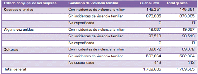 La Encuesta Nacional sobre la Dinámica de las Relaciones en los Hogares, 2006, que señalan que para el estado de Guanajuato la violencia familiar la padecen 234, 010 mujeres.