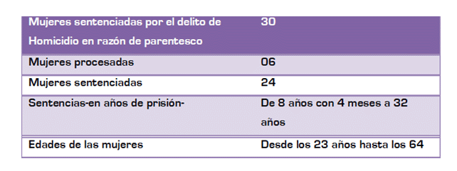 Según un estudio realizado por Elena Azaola en 1997, muestra que de una muestra de 50 mujeres entrevistadas, las cuales 38 de ellas cometieron asesinatos en contra de sus familiares y las otras 12 asesinatos a terceros. “En la mujer, en cambio, el homicidio parece ser el desenlace de múltiples episodios de violencia en 10s que, algunas veces, ella ha ocupado el lugar de víctima, otras, de victimario, y en donde 10s motivos parecen mis complejos y difíciles de descifrar, pues en apariencia subvierten su ser-mujer” ( Lagarde, 1993).