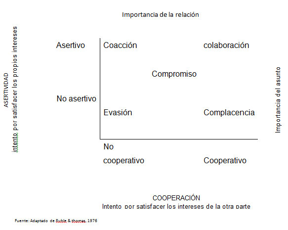 A continuación se muestra una tabla que resume los distintos estilos de comportamiento ante el conflicto desde la perspectiva de asertividad y cooperación: