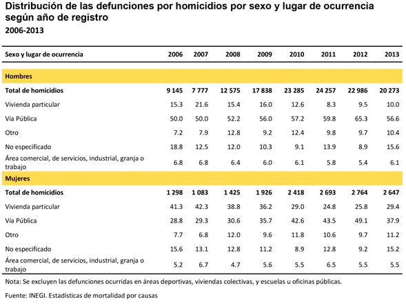 Es importante señalar que entre 2006 a 2013, el patrón de lugar donde ocurrió la lesión o agresión, que era mayoritariamente en la vivienda, se ha ido desplazando y en 2009 estaban casi en el mismo nivel, pero a partir de ese año más mujeres son asesinadas en la vía pública, esto ocurrió particularmente de 2010 a 2012, tiempo durante el cual casi la mitad de las mujeres fue asesinada en espacios públicos (ver tabla 1).