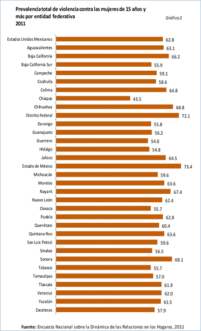 De acuerdo a lo declarado por el INEGI en 2015, la violencia contra las mujeres está ampliamente extendida en todo el país y no se trata de actos aislados sino de un patrón general, ya que aun cuando en entidades como el Estado de México, el Distrito Federal (ahora Ciudad de México), Chihuahua y Sonora se observan las prevalencias más altas, todas, excepto la registrada en el Estado de Chiapas, están por encima del 50 por ciento (ver gráfica 1).