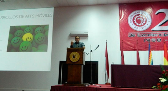 Representados por el M.T.I. Enrique Aguilar Vargas, Director de Posgrado y Educación Continua, y catedrático de la Facultad de Ingeniería en Computación y Electrónica, se impartió la conferencia Desarrollo de Software Unificado en la era postPC para dispositivos iOS, Android y Windows Phone ante profesionales Bolivianos de la industria de tecnologías de información y alumnos de la Universidad del Valle de Cochabamba.