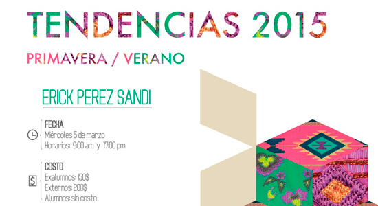 El 5 de marzo se llevó a cabo la conferencia “Tendencias”, organizada por la Escuela de Diseño e impartida por Erick Pérez Sandi Hurtado, quien habló de las propuestas que habrá para primavera–verano 2015. Durante el evento se llevó a cabo también, la presentación del nuevo Consejo Local de Alumnos de la Escuela de Diseño.