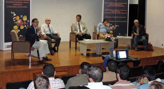 ¿Qué son los transgénicos? ¿Son una alternativa de alimentación viable los organismos genéticamente modificados? ¿Qué riesgos e impactos causan a la salud humana, a la biodiversidad y medio ambiente? Fueron algunas de las interrogantes respondidas por Juan Manuel de la Fuente Martínez, Gerente de Asuntos Regulatorios y Científicos para Latinoamérica Norte de Monsanto; José Rodríguez Macías, Antropólogo y miembro de los Consejos Estatal Hidráulico, Técnico de Aguas de Silao, Greenpeace México y del Comité de Bioética del Hospital Regional de Especialidades de León; Luis Rafael Herrera Estrella, Director Fundador del Laboratorio Nacional de Genómica para la Biodiversidad (LANGEBIO), el cual logró descifrar el genoma completo del maíz y Miguel Lara Flores, Doctor en Investigación Biomédica Básica del Centro de Investigación sobre Fijación de Nitrógeno de la UNAM.