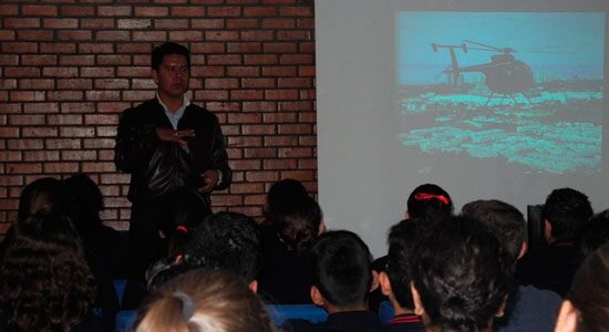 Fueron 90 alumnos, quienes estuvieron atentos a sus anécdotas como comandante de emergencias, contingencias e intervenciones para capturar a quienes están fuera de la ley desde un helicóptero