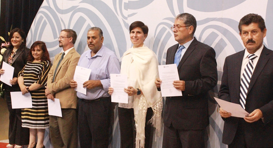 Entre aplausos y ovaciones fueron reconocidos la entrega y el arduo empeño para quienes cumplen 30, 35 y 40 años en la Universidad. La insignia de oro blanco con zafiro fue para Humberto de Anda Padilla, José Julio Carpio Mendoza y Juan Martín Zúñiga por 30 años de permanencia. Por su parte Ma. Gerarda López Arredondo festejó 35 años de trabajo y recibió la insignia de oro amarillo e incrustación de brillante. Finalmente la insignia de oro amarillo e incrustación de diamante fue recibida por la familia de Armando Hernández Ramírez, en su representación, al encontrarse él en un viaje profesional.