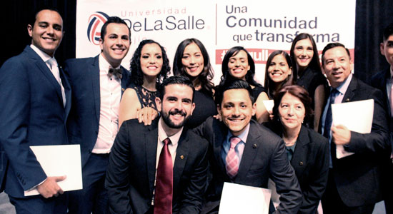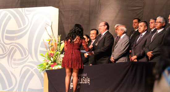 En punto de las 7:40 de la noche cuando el Arquitecto José Amonario Asiáin Diaz de León Vicerrector de la Universidad, tomo la palabra y con emotivos mensajes de compromiso educativo, invito a los egresados de posgrado a tomar el conocimiento como una gran responsabilidad social, evocándolos a la continuo estudio, por lo que les pidió que tomaran su insignia De Lasalle y la colocaran en la solapa del lado izquierdo para que no se olvidara de su casa de estudios.