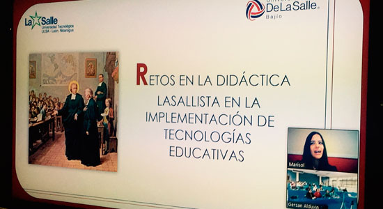 La conferencia impartida por la Maestra Marisol Pérez Servín fue “Retos en la Didáctica Lasallista en la implementación de Tecnologías Educativas”, en donde abordó los principales desafíos para las Universidades Lasallistas en los aspectos pedagógicos, sociológicos, curriculares, administrativos, docente, organizacionales, etc. La coordinación de la conferencia de la Maestra Marisol estuvo a cargo del Maestro Delvin Díaz Membreño, quién es el Vicerrector de Promoción y Desarrollo Humano de nuestra hermana Universidad Lasallista Nicaragüense.