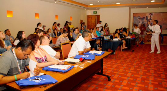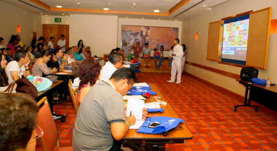 Alejandro transformó la sala de conferencias en un salón de clase y a los asistentes en sus alumnos, mostrándoles de una manera totalmente practica como jugar “Surprise”, dividiendo a los participantes en equipos, explicando las reglas, mostrando los ejemplos y por supuesto llevando a cabo la actividad, misma que consiste en responder a diferentes retos contra el reloj.