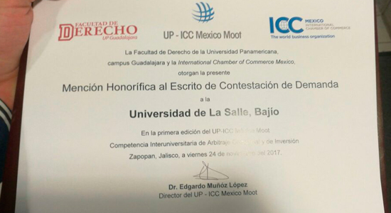 Alumnos de nuestra Casa de Estudios reciben Mención Honorífica por su Escrito de Contestación y Demanda durante la competencia Interuniversitaria de Arbitraje Comercial y de Inversión, en el mes de noviembre.