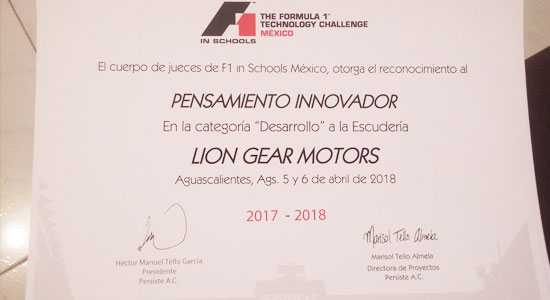 La Escudería Lion Gear Motors quedó en 5º lugar de 13 equipos participantes, y ganó uno de los 4 reconocimientos “Pensamiento Innovador”, por el programa utilizado para el diseño y la manufactura en CNC. Gracias a este reconocimiento, (Persistente A.C), empresa que promueve esta competencia, se interesó en seguir colaborando con Miguel Ángel Alcántar Lugo, para el tema de manufactura en CNC y Carlos Alejandro Pedroza Vargas para proyectos de diseño.