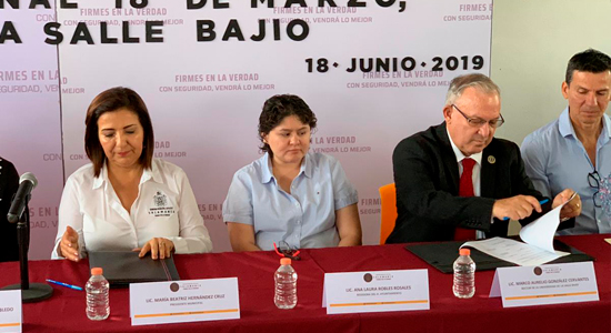 Durante la firma de convenio estuvieron presentes; el Hno. Marco Aurelio González Cervantes, Rector; Edel Maria Espino Ledezma, Directora General del Campus Salamanca y el Alumno Sergio Villalpando Presidente de la Sociedad de Alumnos del Campus Salamanca. También estuvieron presentes la Lic. María Beatriz Hernández Cruz, Presidente municipal de Salamanca. Karla Alejandra Escárcega Robledo, Secretaria del H. Ayuntamiento, Lic. Juan Carlos Razo Guevara, Director de Cultura, Educación, Deporte, Turismo. Así como directivos de la Escuela Vocacional 18 de Marzo y del INAEBA.