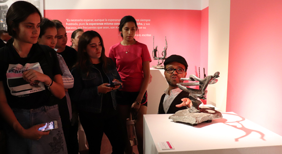 Posterior a ello, se dirigieron a la Sala de la Biblioteca en la que mediante 25 esculturas de bronce podemos apreciar la vida del escultor moreliano Joaquín López de Lara quien busca mediante la creatividad plástica hacer referencia a las emociones que el ser humano experimenta diariamente, a través de figuras que parecen vivir en sueños el artista crea escenas cotidianas que hablan del amor, de la espera, de felicidad, del juego, la melancolía, de compartir con otros las dichas y amarguras de vivir.