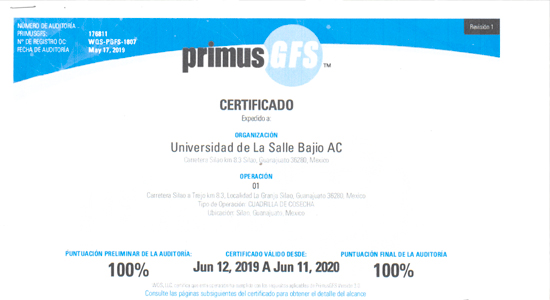 Por otro lado, se realizaron auditorias en temas de seguridad e higiene de las instalaciones, del personal y de sus procesos, desde el más genérico hasta el más específico; otorgando una certificación con vigencia anual al Invernadero de la Universidad De La Salle Bajío.