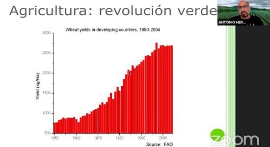 La conferencia comenzó con un acercamiento a nuestros antepasados, ilustrando desde el origen de la agricultura, pasando a su industrialización y su consumo. Además, dio a conocer los impactos ambientales y los problemas que se podrían tener a un futuro, para mantener la producción de alimentos y al mismo tiempo, afectar lo menos posible al medio ambiente.