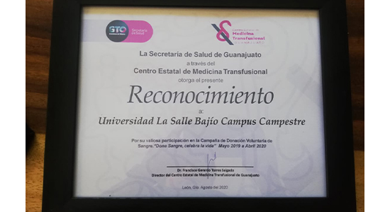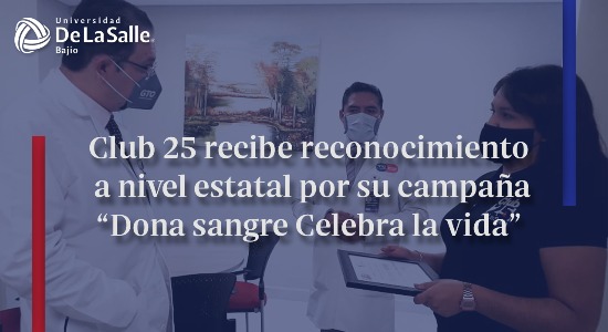 El Centro Estatal de Medicina Transfusional del estado de Guanajuato, otorgó un reconocimiento al Grupo Estudiantil Club 25 de la Universidad De La Salle Bajío, por la labor solidaria que realizan año con año, en la campaña de Donación Voluntaria “Dona Sangre, celebra la vida”, durante el periodo mayo 2019 – abril 2020.