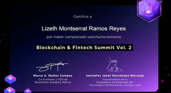 También, se sumó a Blockchain & Fintech Summit Vol. 2 por Blochchain Academy Mexico, la cual, es la mayor academia de blockchain que capacita a los profesionales en América Latina, en donde accedió al Summit debido a una beca del 100% otorgada por haber sido parte del programa Tec Lean Launch. Además de tener la oportunidad de un acercamiento a esta tecnología por parte de profesionales de renombre internacionalmente.