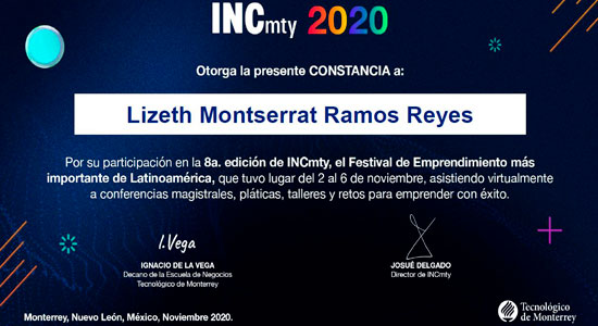 También estuvo virtualmente en el programa Tec Lean Launch julio-agosto 2020, con el Instituto de Emprendimiento Eugenio Garza Lagüera del Tecnológico de Monterrey, en donde fue acreedora a una beca del 50% para la incubación de su proyecto. La idea que se incubó nació de su participación en el Alibaba Get Global Challenge, donde solo se llegó a la segunda fase. A partir de ahí se perfeccionó para pasar a concursar a nivel nacional en el premio Santander.