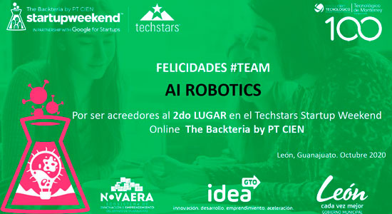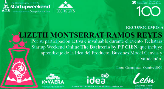 Posteriormente, resultó ganadora del segundo lugar en el Hackathon Techstars Startup Weekend Online Backteria por el PT CIEN, en donde participó con un proyecto dirigido a la educación, profesionalización y certificación en el área de robótica, atendiendo a que en Guanajuato alberga 41 parques industriales y es una materia que se ha potencializado enormemente en el país. En este proyecto obtuvo como premio una nueva incubadora de negocios y el pase al evento INCMonterrey, Festival de emprendimiento más importante y grande de Latinoamérica.