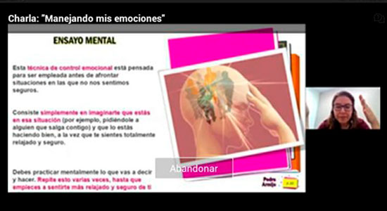 Otra técnica que compartió fue el “ensayo mental”, el cual, está pensado para ser empleado antes de afrontar situaciones en las que no nos sentimos seguros, consiste en generar imágenes de estas situaciones y visualizar que estás haciéndolo bien, a la vez que, te sientes totalmente relajado y seguro. Es una técnica que debes practicar mentalmente lo que vas a decir y hacer, afirmó la experta que es importante repetirlo varias veces, hasta que nos sintamos seguros.