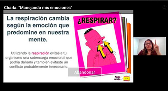 Además, se abordaron temas relacionados con las emociones, haciendo hincapié que pueden ser válidas, útiles y manejables, así mismo, se compartieron algunos recursos y técnicas que los alumnos pueden utilizar para manejar sus emociones, como lo es la “respiración”, siendo un recurso para evitar que nuestro organismo se sobrecargue emocionalmente, así como, evitar un conflicto probablemente innecesario.
