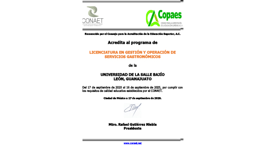 La Universidad De La Salle Bajío por medio de la Facultad de Turismo y Gastronomía solicitó el proceso de evaluación para la acreditación del programa educativo de Licenciatura en Gestión y Operación de Servicios Gastronómicos ante el Consejo Nacional para la Calidad de la Educación Turística de México A.C. CONAET, organismo reconocido por el Consejo para la Acreditación Superior COPAES.