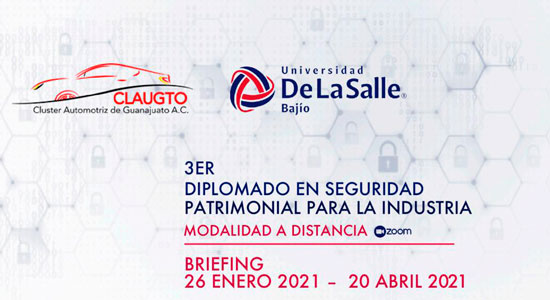 Derivado de la vinculación entre la Universidad De La Salle Bajío y el Clúster Automotriz de Guanajuato, se llevó a cabo el arranque de la 3ra Generación del Diplomado en Seguridad Patrimonial en la Industria, en modalidad virtual, con finalidad de fortalecer a las empresas que forman parte del sector automotriz, así como, desarrollar habilidades de gestión para la creación y/o mejora del departamento de seguridad patrimonial.
