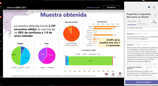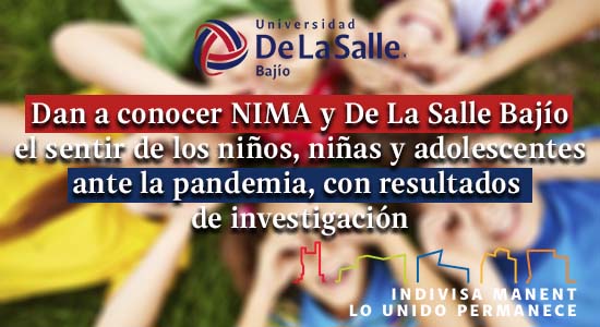 Los resultados de la investigación de “Percepción de Niñas, Niños y Adolescentes de los efectos de la pandemia por la COVID-19, desde el enfoque de Derechos Humanos”, que realizaron entre NIMA Centro de Promoción de Derechos Humanos de Niñas, Niños y Adolescentes de Guanajuato y La Universidad de la Salle Bajío, se presentaron a través de la plataforma Microsoft Teams.