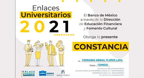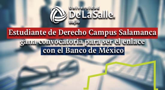 Fernanda Flores, alumna de la carrera de Derecho de la Universidad De La Salle Bajío, Campus Salamanca, fue seleccionada para ser Enlace Universitario con el Banco de México (EUB), siendo ella la cuarta generación de alumnas en participar. Dicha convocatoria se lanzó en octubre del año pasado. Siendo aceptada como EUB 2021 el 4 de diciembre del 2020.