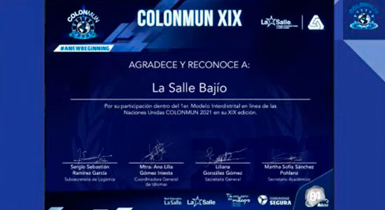 Un total de 12 alumnos de Campus Américas, Juan Alonso de Torres y San Francisco del Rincón, dos de ellos de secundaria y 10 de preparatoria, de la Universidad De La Salle Bajío participaron como delegados en la edición 2021 del COLONMUN de los Distritos Antillas México Sur y México Norte.