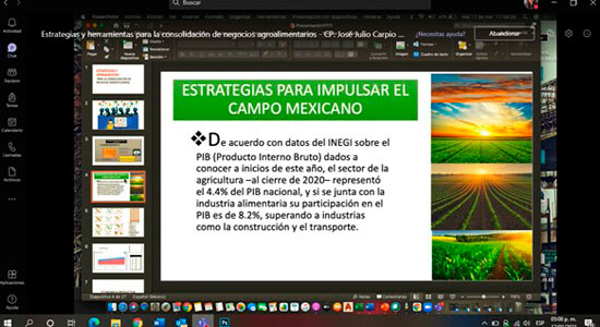 En la charla del Mtro. José Julio Carpio Mendoza explicó algunas estrategias para impulsar el campo mexicano: “De acuerdo con datos del INEGI sobre el Producto Interno Bruto (PIB) dados a conocer a inicios del siguiente año, representó el 4.4% del PIB nacional, y si se junta con la industria alimentaria su participación en el PIB es del 8.2% superando industrias como la construcción y el transporte”.