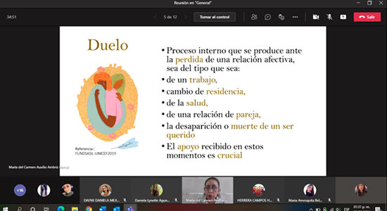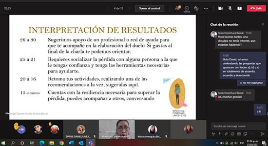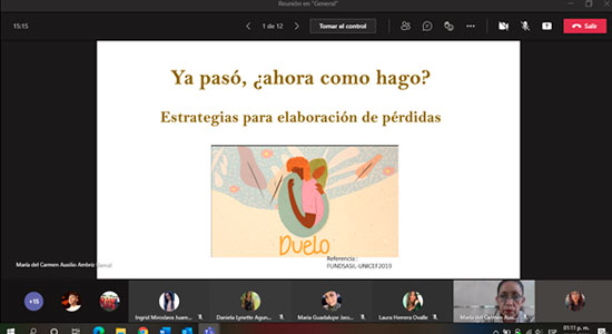 “¿Ya pasó, ahora qué hago?, estrategias para elaborar las pérdidas”, impartido por la Mtra. Blanca Estela Báez, fue el primer tema que se abordó, en este evento realizado a través de Microsoft Teams, en el que, la experta compartió con los participantes, un pequeño cuestionario de diagnóstico para determinar las acciones que se deben realizar ante la pérdida de un ser querido.