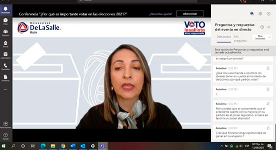 “Muchas felicidades por hacer realidad estos espacios, De La Salle Bajío es la única institución que sé que están haciendo algo respecto a las elecciones y fomenta la participación de sus estudiantes, me da mucho gusto formar parte de esto y gracias por brindarme el espacio”, compartió la ponente.