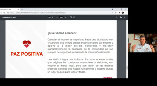 Posteriormente, expresó algunas de sus propuestas, como, por ejemplo: vivir tranquilamente y de manera segura aumentando los sueldos de los policías; generar acciones de prevención al delito; crear cultura de recreación y deporte; determinar comités ciudadanos; no permitir la impunidad. En materia de salud, compartió que, desea llegar a aquellos sectores más vulnerables de la población con servicios de salud móviles; brindar medicina básica en los hogares; aprovechar la tecnología para tener videoconsultas; darle prioridad a la salud mental con atención a las personas en manos de especialistas.