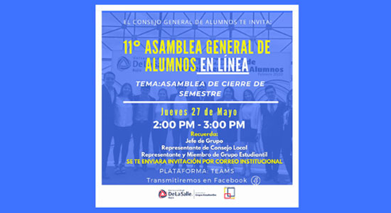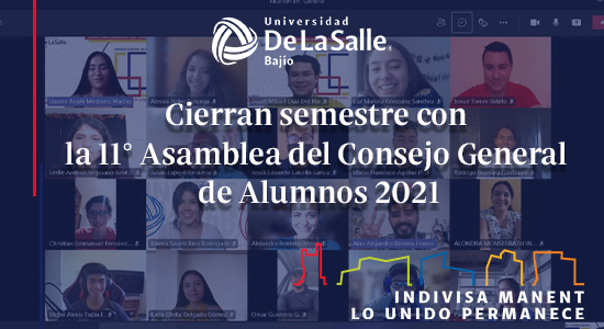 Cerca de 50 estudiantes miembros del Consejo General de Alumnos (CGA) de la Universidad De La Salle Bajío, se reunieron a través de la plataforma de Microsoft Teams para llevar a cabo la 11° Asamblea, a fin de informar y promover la participación de la Comunidad Estudiantil, con respecto a temas relevantes de esta Casa de Estudios, así como, mantener una comunicación entre los mismos representantes.