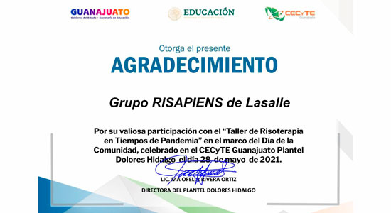 Este taller fue dirigido a 40 docentes y estudiantes del CECyTEG Plantel Dolores Hidalgo, como parte de sus actividades del “Día de la Comunidad 2021”, en donde compartieron ejercicios de crisoterapia, la cual, es una terapia a base de sales de oro para disminuir la ansiedad en estos tiempos de crisis causados por la pandemia por COVID- 19.