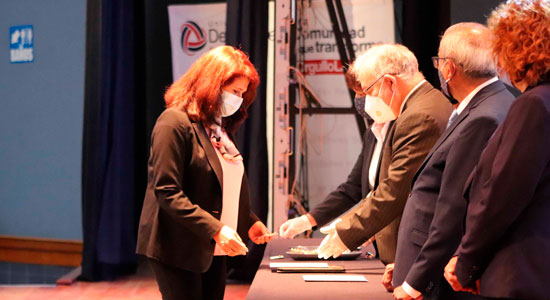 Como medida adicional, siguiendo el protocolo institucional de la ceremonia, los egresados desfilaron frente a la mesa del presídium, instalada en el escenario del auditorio, para tomar respectivamente sus constancias, así como también, su insignia institucional, mientras a la distancia saludaban a las Autoridades Académicas que los acompañaron.