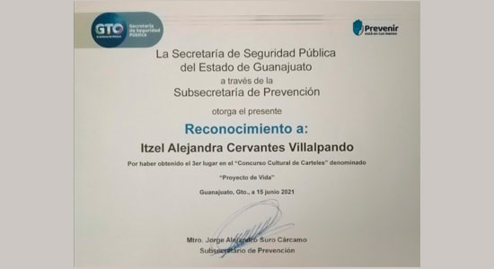 Ivanna Ofelia Ávila Uribe, Ivana Berenice Rivera Moreno e Itzel Alejandra Cervantes Villalpando, estudiantes de la Universidad De La Salle Bajío Campus Juan Alonso de Torres, conquistaron los tres primeros lugares respectivamente del concurso Cultural de Carteles que organizó la Secretaría de Seguridad Pública del estado de Guanajuato.
