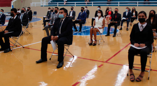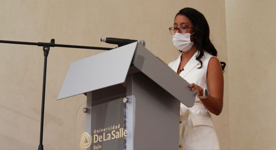 La alumna Noelia Isabel Gallegos Ríos dirigió unas emotivas palabras a nombre de todos los egresados y egresadas de su generación, donde agradeció a sus docentes y familiares por el apoyo brindado a lo largo de sus estudios, además, invitó a sus compañeros a continuar preparándose y esforzándose en su vida laboral siempre con los principios de Fe, Fraternidad y Servicio.