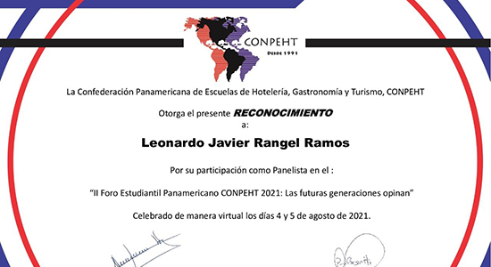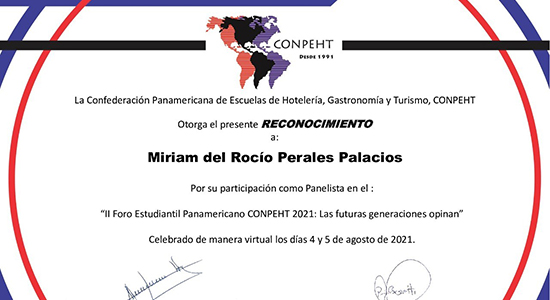 Miriam del Rocío Perales Palacios estudiante de la Licenciatura en Negocios Turísticos y Leonardo Javier Rangel Ramos alumno de la Licenciatura en Gestión y Operación de Servicios Gastronómicos de la Universidad De La Salle Bajío participaron como ponentes en el II Foro Estudiantil Panamericano de la Confederación Panamericana de Escuelas de Hotelería, Gastronomía y Turismo (CONPEHT) 2021: “Las Futuras Generaciones opinan”.