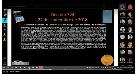 "Últimas reformas al código civil en materia familiar" fue la penúltima conferencia a cargo de la Mtra. Carolina Orozco Arredondo, el derecho civil ha estado en un cambio continuo, a partir de las reformas de la Constitución en el 2011, ahora se analiza de una perspectiva enfocada más en los derechos humanos. Compartió algunas reformas realizadas a parte del 2018, donde se modificaron algunas cuestiones relacionadas con las condiciones durante un divorcio, los temas de daño moral, la patria potestad y las obligaciones parentales. Y la creación de una plataforma donde se puede ingresar el nombre de la persona y verificar si es deudor alimentario, es de uso reciente en México, pero en otros países de Latinoamérica como Chile y Argentina tiene más antigüedad.