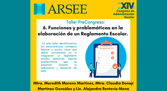 Se impartió el taller: “Funciones y problemáticas en la elaboración de un Reglamento Escolar” a cargo de la Lic. Alejandra Rentería Mena, la Mtra. Meredith Moreno Martínez y la Mtra. Claudia Donají Martínez González; en donde se propuso conocer y desarrollar habilidades que permitan integrar un reglamento escolar, identificando y resolviendo algunas problemáticas generales que se presenten durante su elaboración, desarrollo y aplicación.