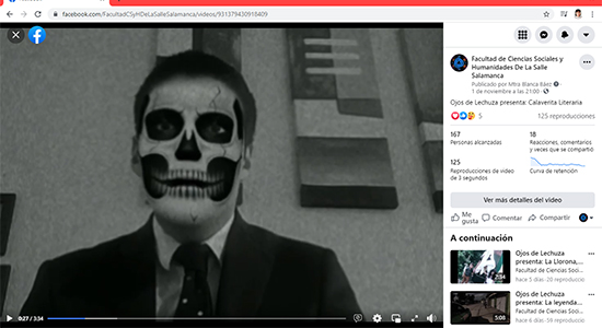 Además, se realizaron vídeos que fueron publicados a través de la página de la Facultad de Humanidades en Facebook, en ellos relataron las leyendas de: “La niña que pidió que la cambiaran de tumba”, “La leyenda del minotauro”, “La Llorona”, “Calaveras literarias”, “La historia de la hiena de Querétaro”, “La carretera de la muerte”, “La Pascualita”, “La casa de los lamentos” y “Los Carcamanes”.