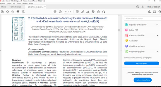 “Efectividad de anestésicos tópicos y locales durante el tratamiento endodóntico mediante la escala visual analógica”, fue el título de la investigación del Dr. Josué Roberto Bermeo Escalona, Profesor Investigador de Tiempo Completo de la Facultad de Odontología de la Universidad De La Salle Bajío, la cual, fue publicada en la revista Ciencia Odontológica.