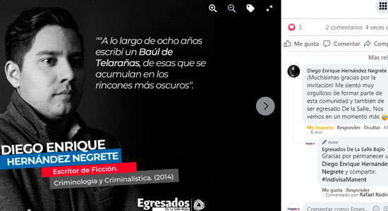 Una narrativa de cuentos de terror y misterio en donde se plasma un sello criminológico, es lo que caracteriza a la obra: “Baúl de las telarañas”, del autor Diego Enrique Hernández Negrete, egresado en Criminología y Criminalística (2014) por la Universidad De La Sale Bajío, quien presentó su libro a través de la plataforma de Microsoft Teams.