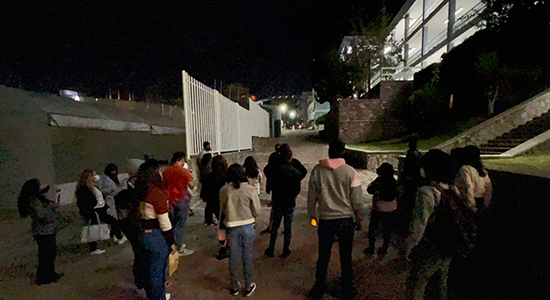 Este recorrido nocturno tuvo como propósito abonar en la identidad y pertenencia de la Comunidad Universitaria, quienes, bajo la guía de Axel Torres, estudiante de octavo semestre de Comunicación y la Lic. Kitzia Torres, Responsable de Formación de Públicos, conocieron algunas historias de varios puntos del Campus Campestre.