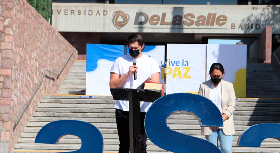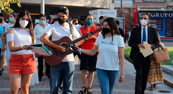 Vestidos de blanco para significar la Paz, la comunidad se reunió en las escalinatas del edificio de Rectoría del Campus Campestre, en donde se inició con una oración acompañada con cánticos.