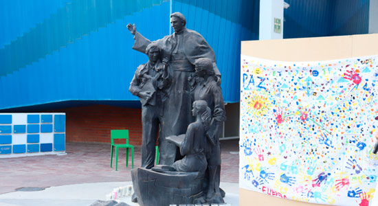 Posteriormente, se hizo un recorrido hasta la escultura de nuestro Fundador, la cual lleva el nombre de: “Llamados a bogar mar a dentro” y se ubica en la Plaza de la Fundación, donde se encontraba una mampara con una manta que tenía la silueta de la paloma de la Paz, para ser coloreada con huellas dactilares de los ahí presentes, mientras que, por la parte de atrás de esta mampara, se invitó a colocar una intención por la Paz.