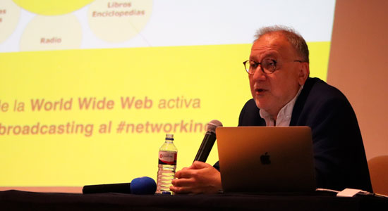 El ponente habló sobre fotografía, transmisiones, redes sociales, arte, psicología, así como de la historia y evolución de los medios de comunicación; “A partir de la llegada de la web va a empezar una transición a un sistema centrado en broadcasting a uno centrado en networking”, compartió el Doctor en Lingüística aplicada.